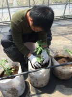 今回は廃熱システムを使った実証実験での作業の様子を紹介させて頂きたいと思います。 昨年度の冬期間はスティックブロッコリーの栽培を行っておりましたが、春からはトマトを栽培します。「シンディースイート」という品種です。早速定植の方を行いました。