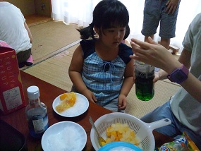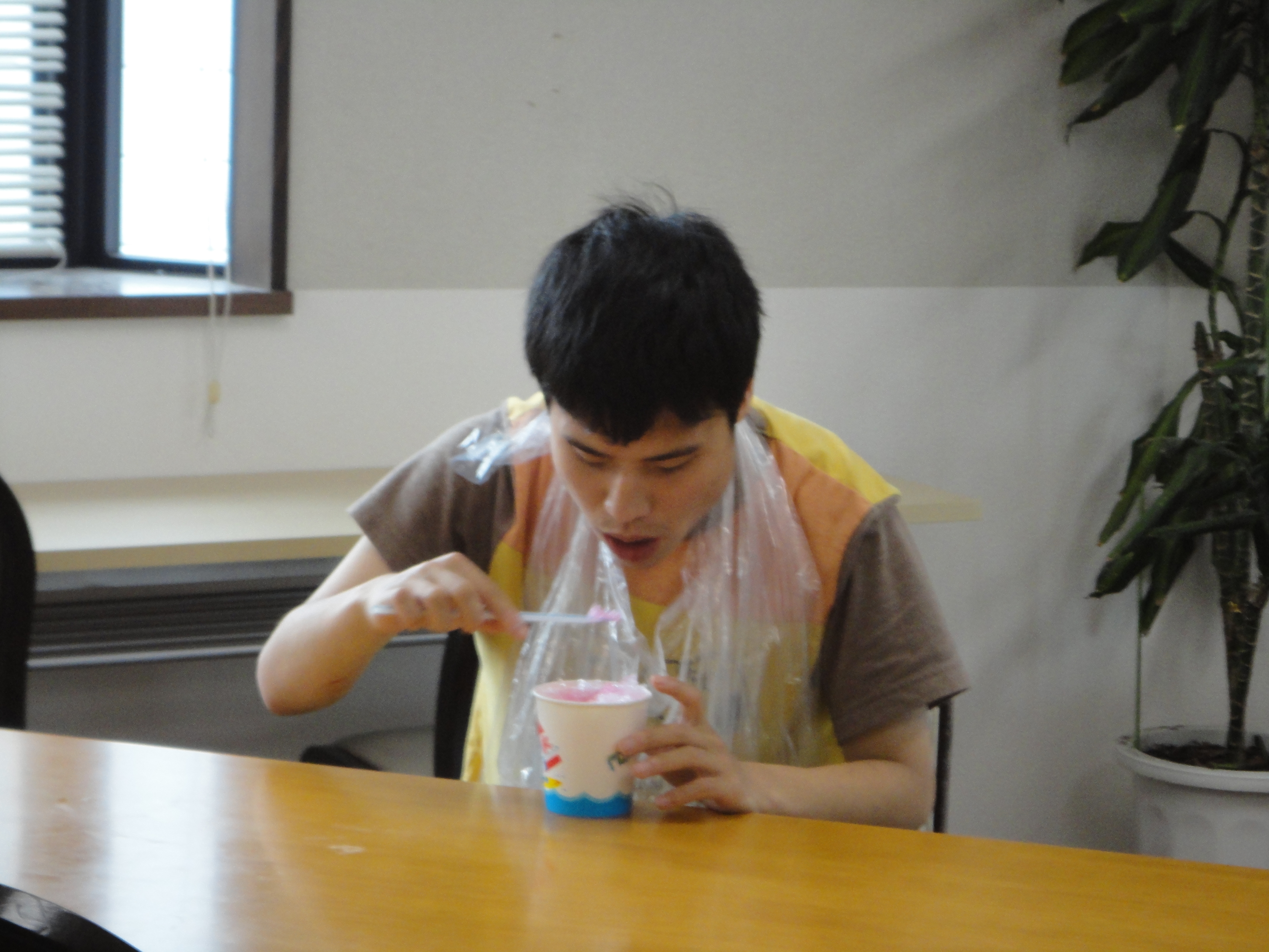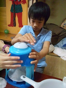 かき氷はラップを丸めて好みの色で色付けしたものを折り紙で作ったコップに入れてストローをくっ付けたら完成です♪