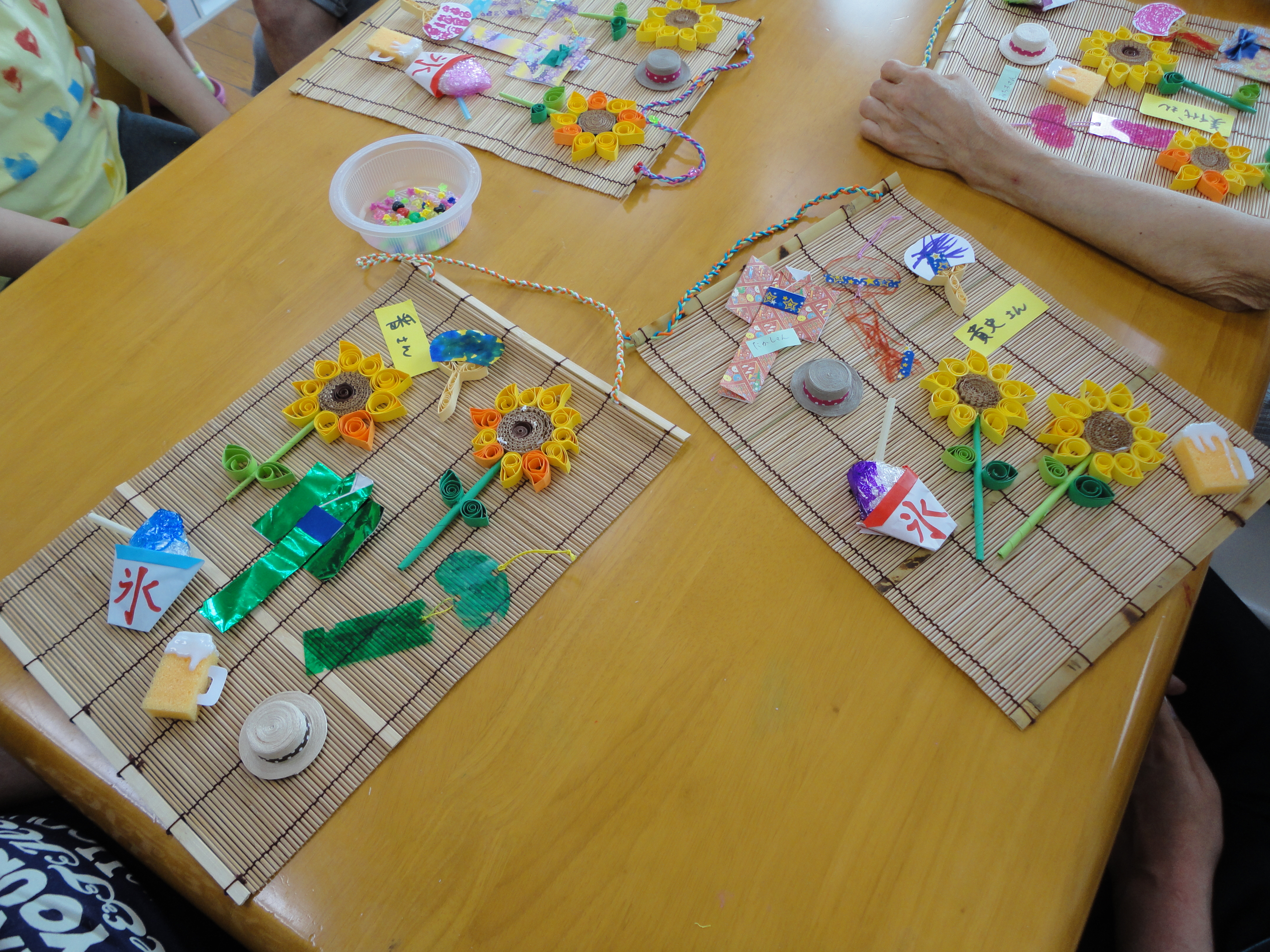 ひまわりとうちわはペーパークイリングの技法を使いました。